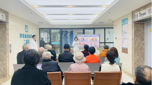 活动现场,医护人员播放重阳节科普养生专题片,伴随着舒缓的音乐和重阳节登高望远、插茱萸等习俗的播放,患者和家属们一边品着茶饮,一边学习感受重阳节养生知识。随后,阳国彬为大家讲解重阳养生与肿瘤血液病患者秋冬护理的适配要点。他重点分享“秋冬泡脚护养技巧”“节气饮食注意事项”等实用方法。讲解中还穿插互动问答,比如“重阳节喝菊花酒的养生意义是什么”“重阳节后老年人该如何保养身体”等等,参与活动者还可获得暖心小礼品。