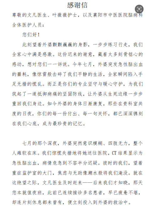 “正是你们的专业坚守与暖心守护,让外婆从生死边缘一步步重回我们身边……”近日,襄阳市中医医院脑病科收到一封情真意切的感谢信。信中,患者家属以真挚的情感,表达了对该科医生文凡、护士叶薇薇及全体医务人员的深深谢意。