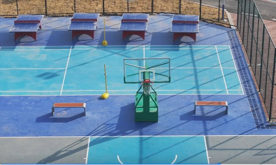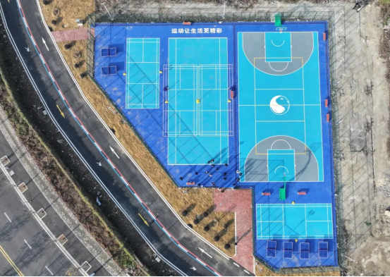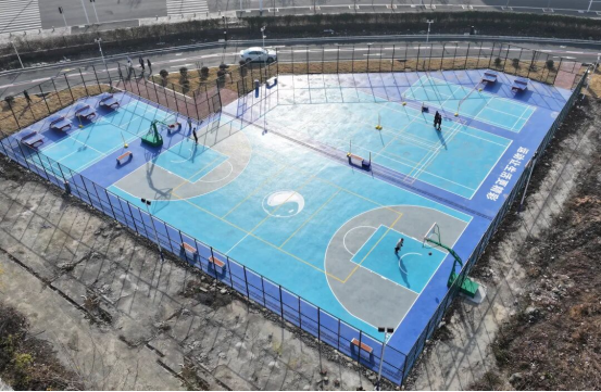 多功能运动场总占地面积约1200平方米,功能布局完善,涵盖1个标准篮球场、1个标准网球场、2个标准羽毛球场以及6个乒乓球场,并配套有健身步道及基础健身区域。