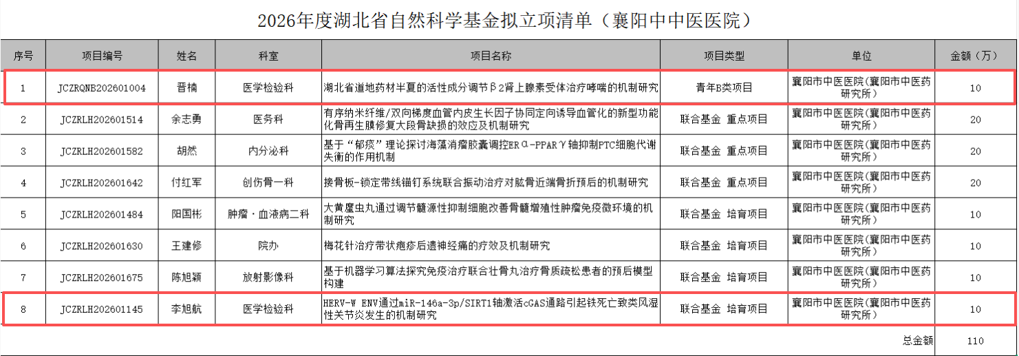 近日,襄阳市中医医院医学检验科学科建设与科研创新领域再获重要进展:由晋楠博士申报的《湖北省道地药材半夏的活性成分调节β2肾上腺素受体治疗哮喘的机制研究》课题、由李旭航博士申报的《HERV-W ENV通过miR-146a-3p/SIRT1轴激活cGAS通路引起铁死亡致类风湿性关节炎发生的机制研究》课题成功获批湖北省自然科学基金项目立项,实现省级基础研究立项数量与科研经费规模双突破,标志着科室在检验医学基础研究、临床转化应用及学科内涵建设层面迈上新台阶。