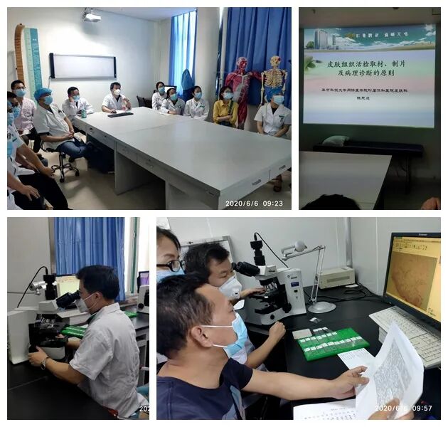 当天,陈思远在该院皮肤科主任王建修的陪同下深入临床,查看了住院及门诊疑难病例,并向该科医生详细讲解了疑难皮肤病的诊断思路及鉴别,还针对个别患者的典型病症作出诊断意见和治疗建议。随后,陈思远为皮肤科全体医生进行了皮肤病理知识专题学术讲座,对皮肤组织活检取材技巧、细节以及病理诊断的原则进行了详细讲解。此外,还与皮肤科王建修主任、病理科王玮主任进行了病理阅片交流,对于临床中的疑难病理、诊断困难的病例进行讲解指导,以提高临床医生对于病理诊断的能力与经验。