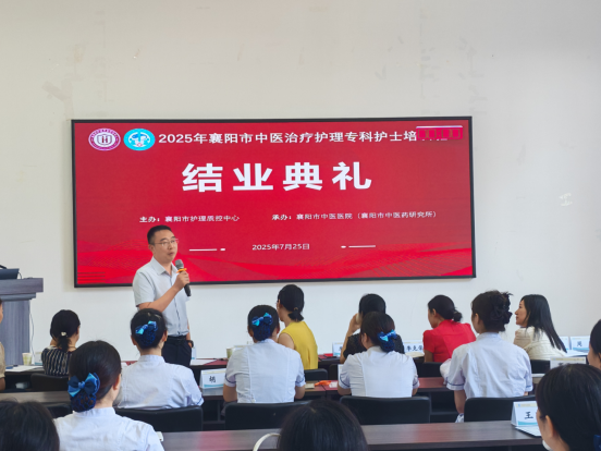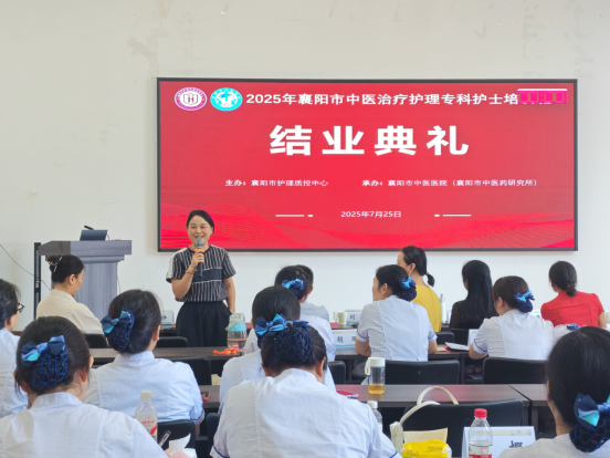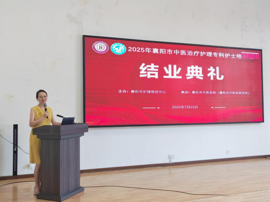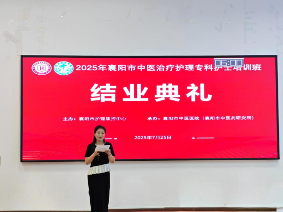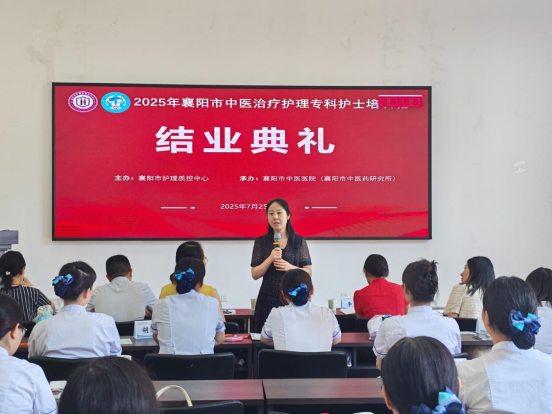 7月25日,由襄阳市护理质控中心主办、襄阳市中医医院承办的“2025年襄阳市中医治疗护理专科护士培训班”结业典礼,在襄阳市中医医院举行。医务处副主任陈嘉、科研处副主任李玉婷、针灸科副主任邓桂元、护理部副主任刘瑜、室主任李克荣、门诊妇儿片区科护士长秦安敏、内科片区科护士长王铮、脑病科护士长周翠出席典礼,培训班全体学员、师资齐聚一堂,共同为中医护理精进之旅画上圆满句号。典礼由中医护理专项学组副组长张再勤主持。