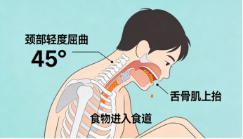 意识清楚可经口进食者进食时尽量采取坐位或半卧位,颈部轻度屈曲约45°,使食物更容易进入食道,进食后应静坐休息,避免立即躺下。