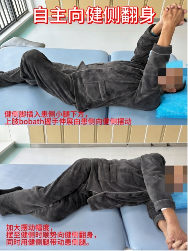 2.对于可主动翻身患者优先练习向患侧翻身,逐渐过渡到向健侧翻身。在进行翻身训练时,家属要陪同在旁保护患者安全,防止患者意外坠床。