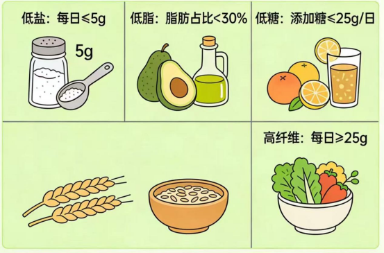 原则:低盐、低脂、低糖、高纤维