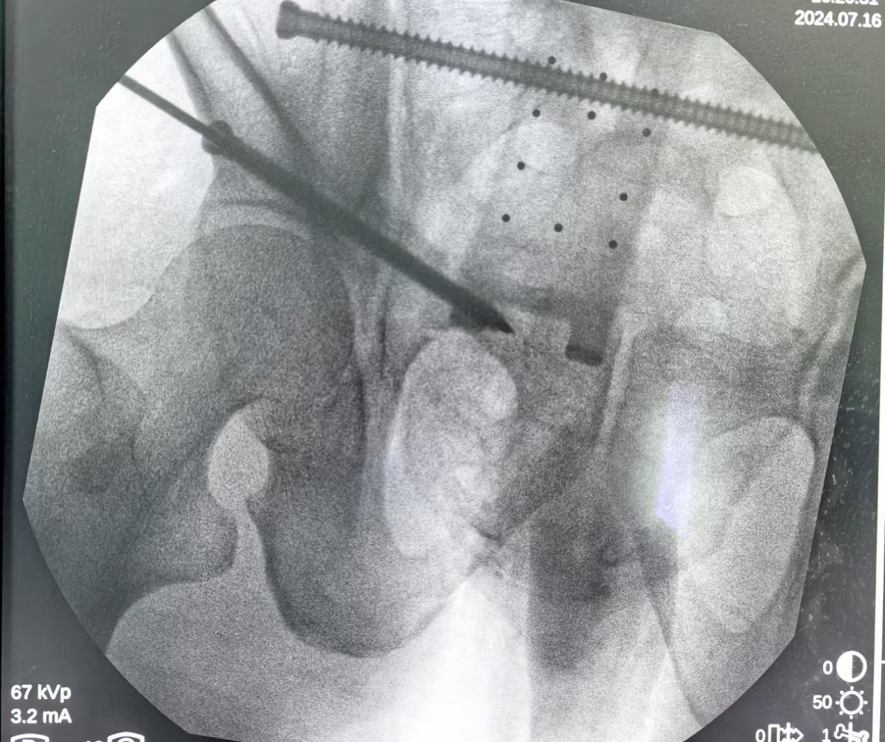 术中孙志波首先将定位追踪器安置在患者髂棘合适位置上,再把C型臂X光机透视所得患者骨盆影像资料导入手术机器人中,通过机器人自动化算法将影像图片与骨盆实体情况进行精准配对,并在显示器上规划好骶髂螺钉位置、长度以及角度,最后孙志波在定位套筒的导航下准确无误地将骶髂螺钉植入患者体内。术中全程通过机器人监视下调整角度,所有参数都经过算法精密推演,临床精度可达 0.1 毫米以内。从而可达到快速定位、精准植入、切口仅用1cm,术中出血量小,手术安全顺利。术后患者病情基本稳定,骨折所引起的疼痛已明显减轻。