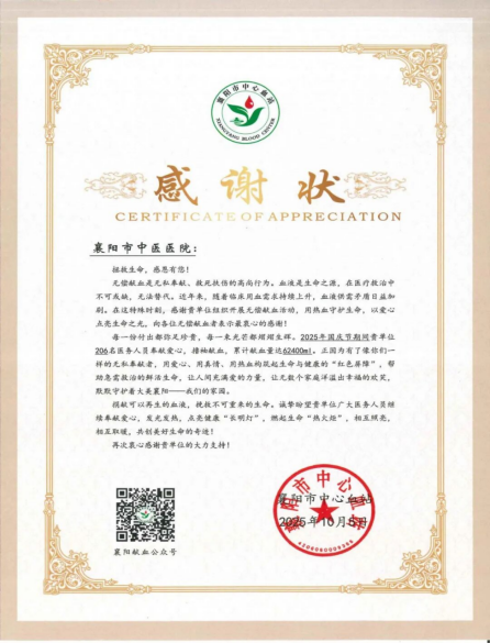 “感谢贵单位组织开展无偿献血活动,用热血守护生命,以爱心点亮生命之光,向各位无偿献血者表示最衷心的感谢!”感谢状中写道,“正因为有了像你们一样的无私奉献者,用爱心、用真情、用热血构筑起生命与健康的‘红色屏障’,帮助急需救治的鲜活生命,让人间充满爱的力量,让无数个家庭洋溢出幸福的欢笑,默默守护着大美襄阳-我们的家园……”