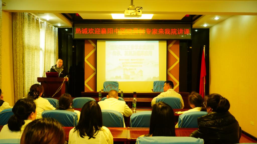 结束纪念馆的参观后,大家一同来到板桥店镇中心卫生院,开展基层医疗帮扶与学术交流活动。在学术交流环节,“襄阳何氏正骨”第六代代表性传承人周肃陵以“襄阳何氏正骨学术流派的传承、发展及临床应用”为题,详细梳理了何氏正骨跨越百年的传承脉络。他从“摸、接、端、提”等传统正骨八法入手,深入浅出地讲解了“襄阳何氏正骨”在骨折、脱位等方面的独特优势及现代临床应用,让基层医护人员近距离感受到了传统医学的魅力。