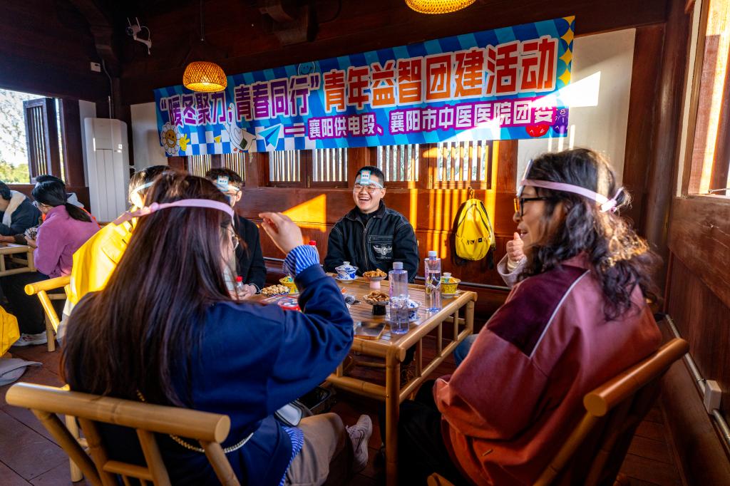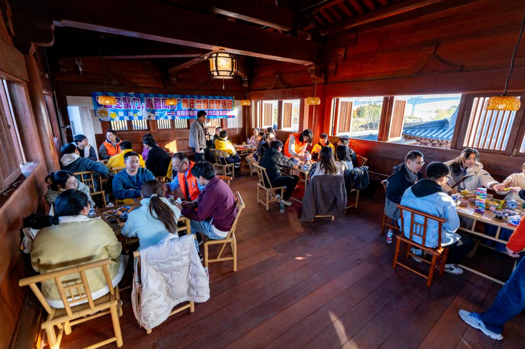 户外的活力尚未褪去,室内的智慧碰撞已然开启。在涧南院茶馆内,设置了4大主题区,抽积木、策略博弈、创意故事、UNO……贴近当下年轻人喜好的益智游戏让现场笑声不断,青年们智商在线,在默契配合中打破壁垒,趣味博弈里呈现团队力量。益智活动结束后,有的青年投壶竞技,有的晒着暖阳喝着热茶,尽情享受“慢节奏”带来的丝丝惬意。