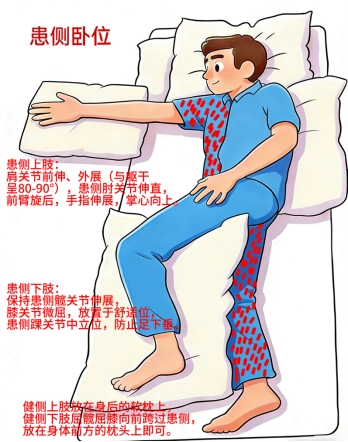 对于脑卒中患者,患侧卧位是较为推荐的体位。该体位使患侧躯干处于伸展状态,可以减少痉挛的发生,并可增加对患侧的感觉刺激输入,同时不影响健侧的正常使用。