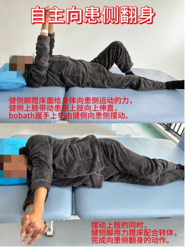 2.对于可主动翻身患者优先练习向患侧翻身,逐渐过渡到向健侧翻身。在进行翻身训练时,家属要陪同在旁保护患者安全,防止患者意外坠床。